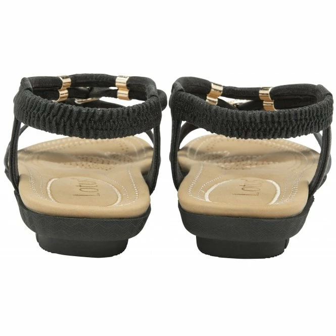 The women’s Lotus Bettina sandal is highly distinctive, exceptionally comfortable and promises 24/7 style on holiday! Enhancing the upper of this flat, open toe, black sandal is polished metal hardware and imitation crystals. Comfort is amplified by the incorporation of a cushioned insock and an elasticated slingback.