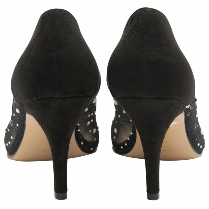 The perfect pairing to a wealth of glamorous looks is the Lotus Maria court shoe. This feminine silhouette boasts a semi-sheer upper that is enhanced by a flurry of sparkling diamantes. A sumptuous textile has also been utilised and incorporated on the soft almond pointed toe, as well as on the heel counter, the slender 9cm stiletto heel and applied as a delicate trim. This Lotus ladies’ black shoe has been designed to coordinate with the Lotus Lissa clutch bag that boasts the same identifiable finishing touches.
