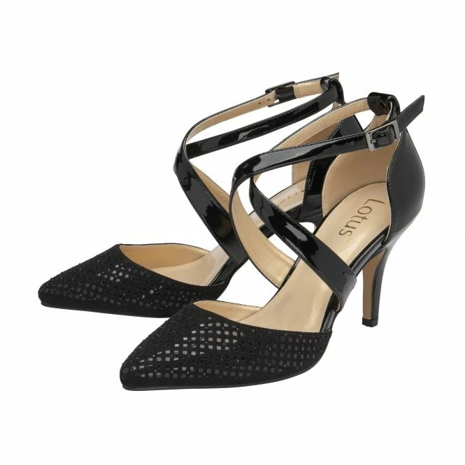 The perfect pairing to any glamourous look is the Lotus Sophia court shoe.  Giving this Lotus women’s black court shoe a decorative finish is the regimented laser cut out detailing that is highlighted by delicate diamantes that sparkle as the light catches them. With a sleek pointed toe, a cross over strap that fastens with a delicate buckle at the ankle and resting on a slender 9cm stiletto heel, this ladies’ court shoe is certainly a showstopper. The Lotus Sophia court shoe coordinates perfectly with the Dillard handbag.