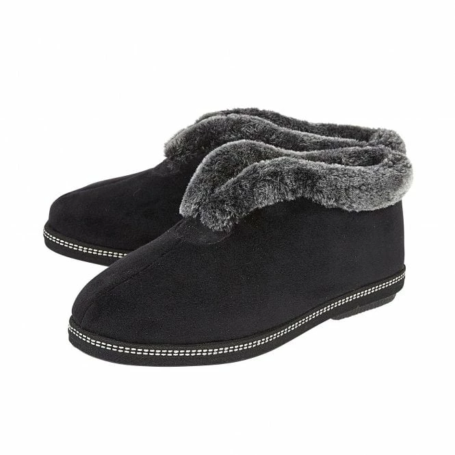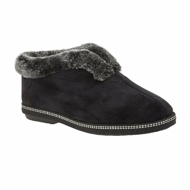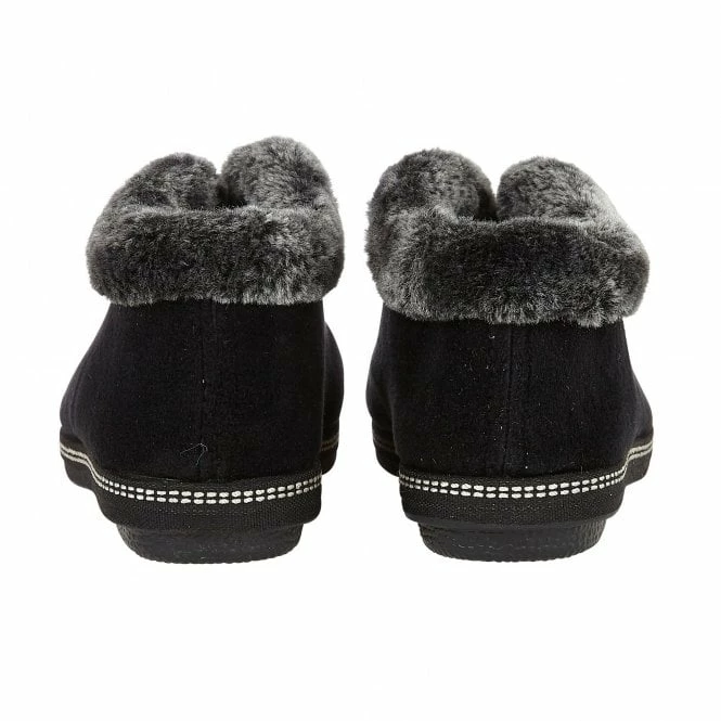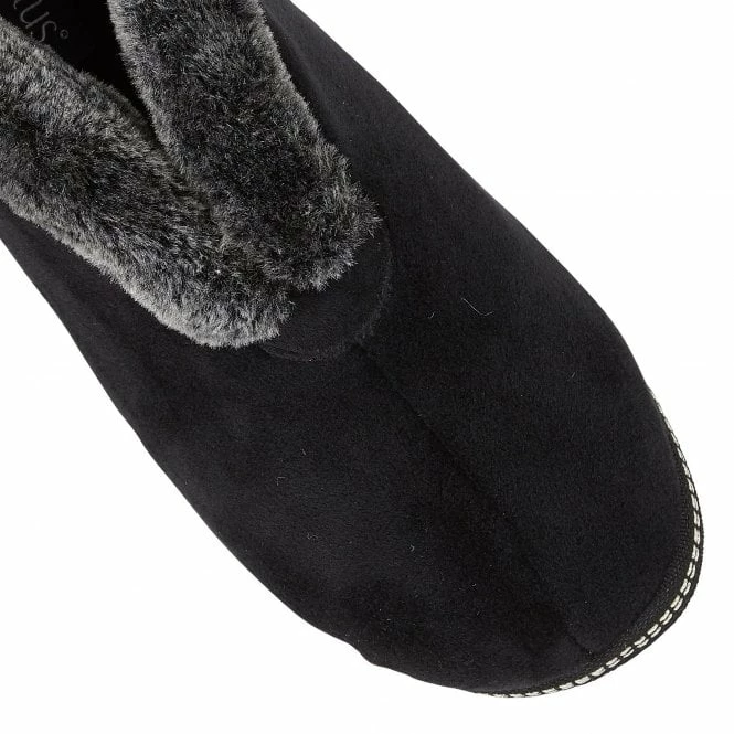 Enhance your at home comfort with the aid of the Lotus Grace women’s slipper. With a sumptuous faux fur collar and memory foam in-socks, this Lotus black slipper bootie promises nothing short of optimal cosiness this winter.  This traditional style incorporates a plush textile upper and also has subtle detailing in the form of double stitching.