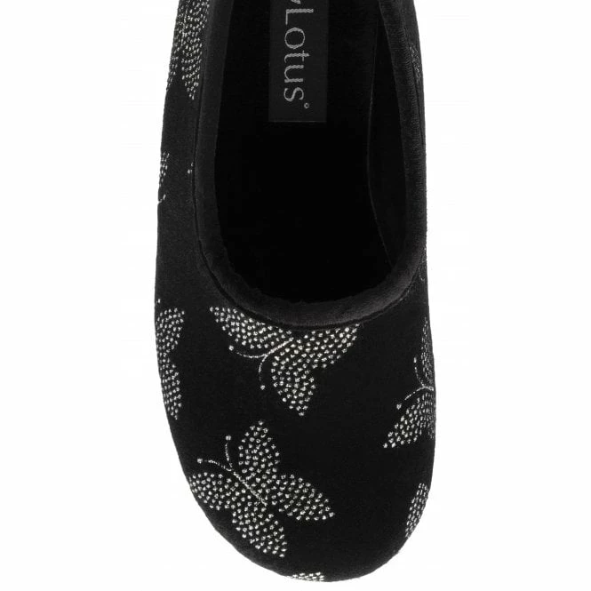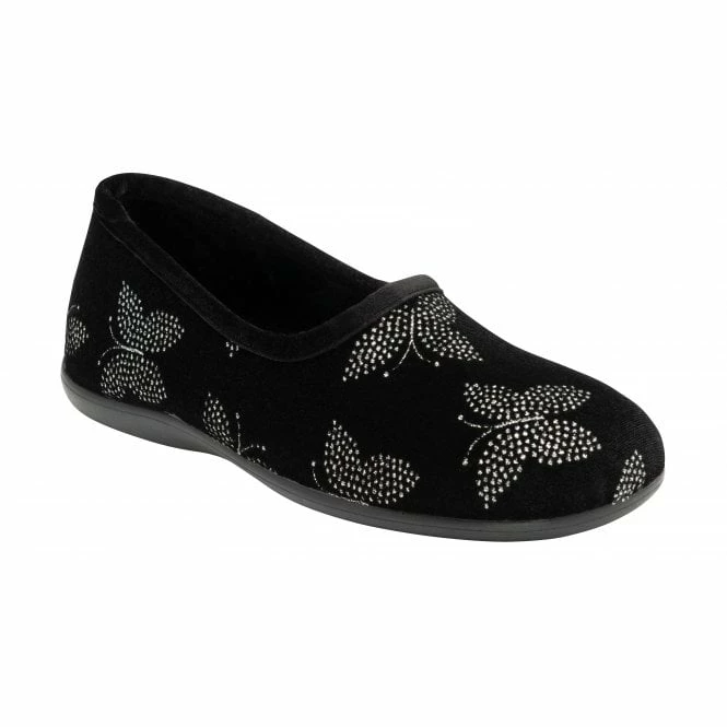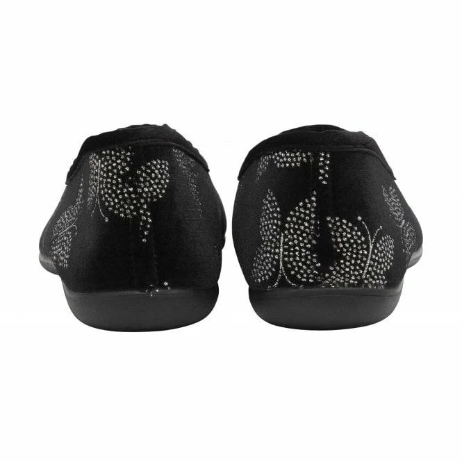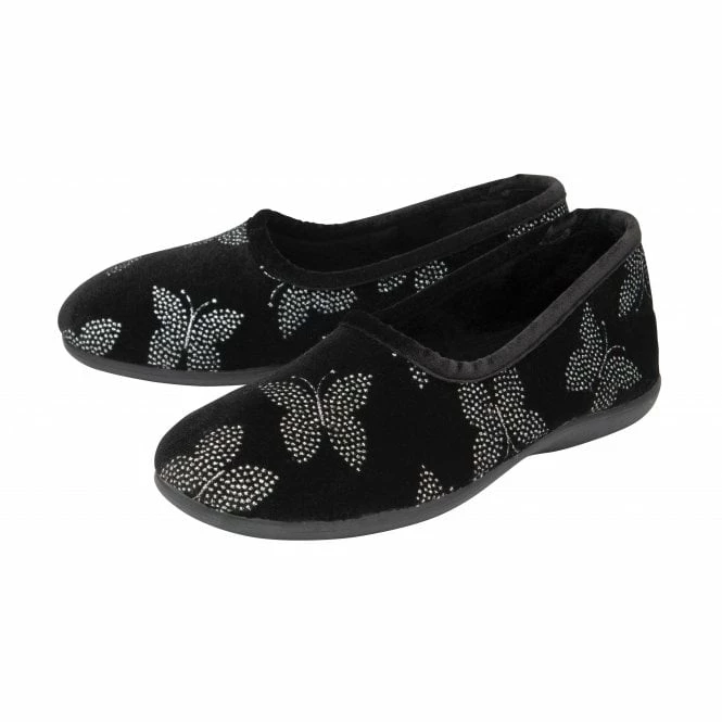 The stunning Lotus Jessie slippers are perfect for adding a touch of sparkle to your loungewear looks. Crafted in a soft velour and featuring feminine glitter butterflies, this women’s black full shoe slipper has a striking aesthetic that oozes appeal. Optimal comfort is also delivered through the incorporation of memory foam in-socks, whilst the rubber outsoles enhance durability.