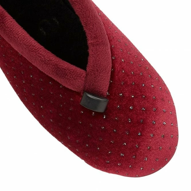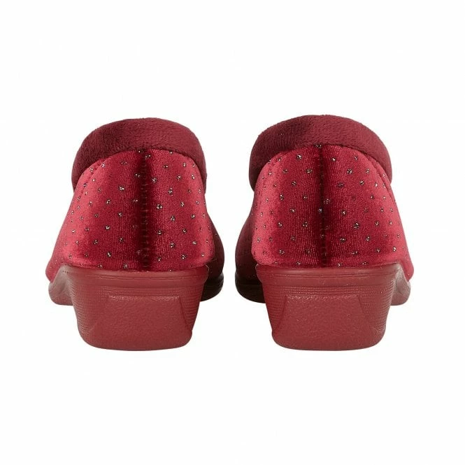 A subtle foil printed spot design is gracefully applied to the upper on the classic Lotus slipper, Beverley. Crafted from burgundy velour, this women’s full shoe slipper is also delightfully enhanced by a soft fleece collar and a subtle wedge heel. This Lotus women’s burgundy slipper also features memory foam in-socks for enhanced comfort and for enhanced durability, a rubber sole unit.  This striking Lotus full shoe slipper will certainly appeal to those that appreciate refined style.