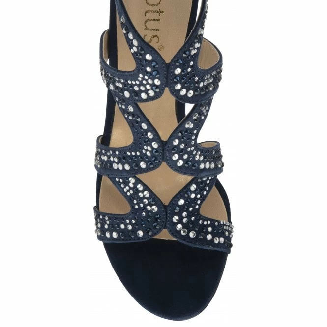 Add some glitz and glam to your ensembles with the Lotus Kelsey heeled sandal. This open toe navy sandal has a strappy upper that entwines up the foot and fastens at the ankle with an adjustable buckle. Accentuated by dazzling diamantes in various sizes and resting on an 8cm stiletto heel, this women’s heeled sandal is a must-have for the festive season and beyond. No party look is complete without Kelsey and the coordinating Lotus Lissa envelope clutch bag.