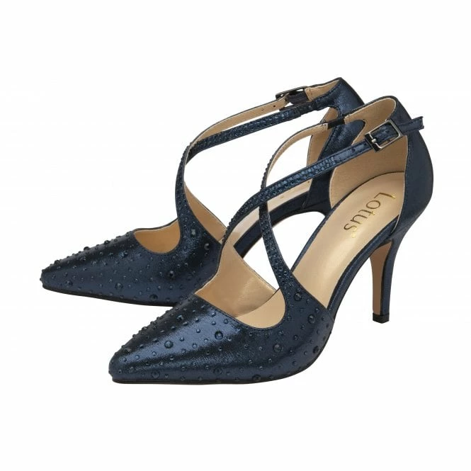 Attention grabbing is one way to describe the high octane Lotus heeled pump, Panache. Diamantes are emblazoned on the textile metallic upper and on the slender cross over straps that fasten at the ankle. Set on a sleek 9cm stiletto heel, this navy Lotus court shoe is the perfect accompaniment for any glamorous occasion. Team the Lotus Panache shoe with the matching Chandra handbag to complete your look.
