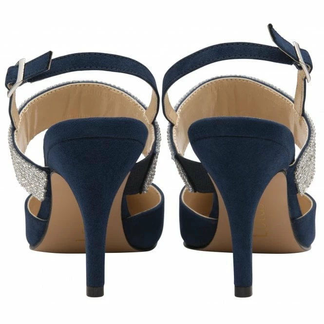 Giving the Lotus Violette court shoe a distinctive finish is a band of delicate diamantes that wrap over the foot. This women’s navy court shoe also features an adjustable slingback, a slender 9cm stiletto heel and soft pointed toe. To add the ultimate finishing touch to any special occasion look, then team Violette with the Lotus Amy clutch bag; this sleek design replicates the decorative diamante band detailing on the front panel of this enviable accessory.