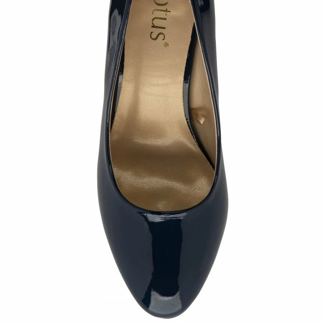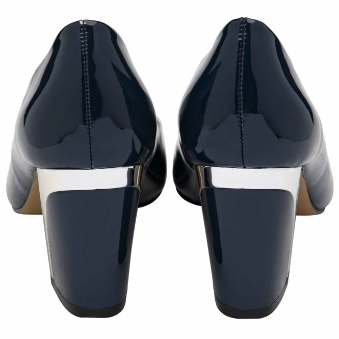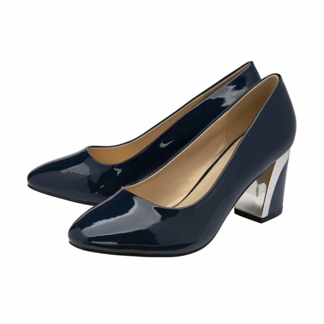 Easy to wear and even easier to style is the Lotus Eden court shoe. This women’s navy heeled pump is set on a 7cm block heel that is accentuated by a decorative metal plate, it features an almond pointed toe and a glossy patent upper. The understated charm and versatility of this ladies’ court shoe will ensure that it is one of the hardest working pairs in your wardrobe.