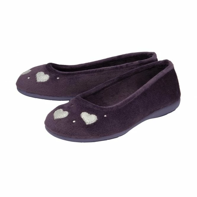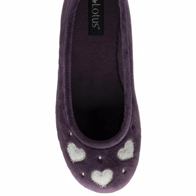 Giving the purple ballerina slipper Lois a delightful finishing touch are cute glitter love hearts and metallic embroidered spots. Crafted with a soft touch textile upper and lining, plus a rubber outsole for enhanced durability, this Lotus women’s full shoe slipper is as practical as it is stylish.