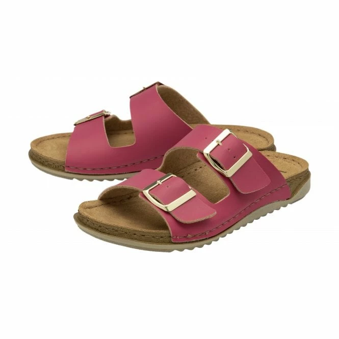 Downtime dressing calls for the Lotus Cortona mule. Double straps finished with an adjustable buckle fastening make up the upper of this almost flat, slip-on, raspberry mule. This women’s summer essential sandal also features a leather insock for enhanced comfort.