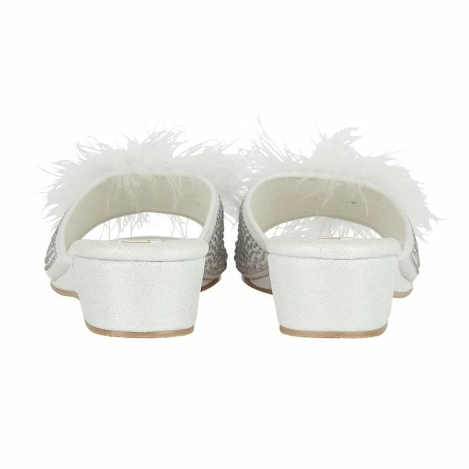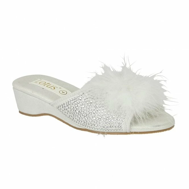 The ever popular Lotus Allure slipper gets an update to further accentuate its glamorous flair and appeal. As per its predecessors a striking feather pom-pom is incorporated, but this season’s new style sees the addition of sparkling diamantes adorning the shimmer textile upper. This open toe, silver women’s Lotus slipper also boasts a subtle wedge heel and an extra padded cushioned in-sock to make it exceptionally comfortable.