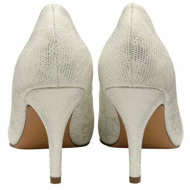 A tonal reptile print is showcased on the upper of the Lotus Petunia court shoe. This women’s silver heeled pump also features a large gem encrusted brooch on the sleek pointed toe and it rests on a slender 9cm stiletto heel. This sleek silhouette that has a distinctive finish marries perfectly with the Rosanna handbag.