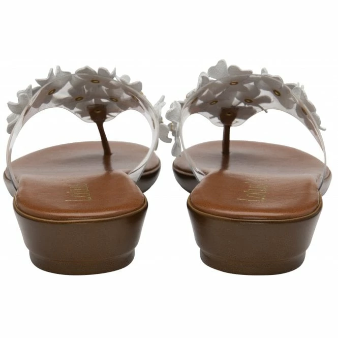 Add feminine charm to a wealth of summer looks with the Lotus Brittany toe-post sandal. This striking sandal rests on a wearable 3cm wedge heel, but it is the transparent strap that is beautifully enhanced by feminine 3-D white flowers that are further enriched by a gold stud and delicate diamante centres that gives this Lotus women’s sandal endless appeal. This women’s white sandal is part of the Lotus made in Italy range.