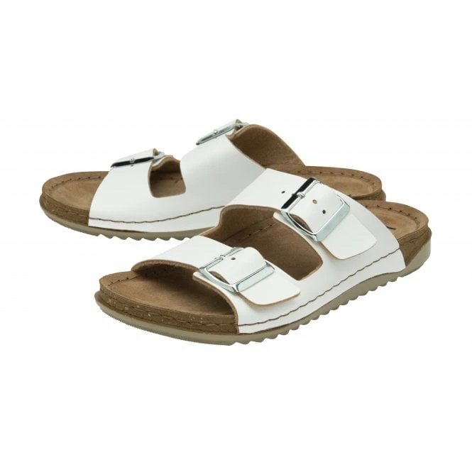 Downtime dressing calls for the Lotus Cortona mule. Double straps finished with an adjustable buckle fastening make up the upper of this almost flat, slip-on, white mule. This women’s summer essential sandal also features a leather insock for enhanced comfort.