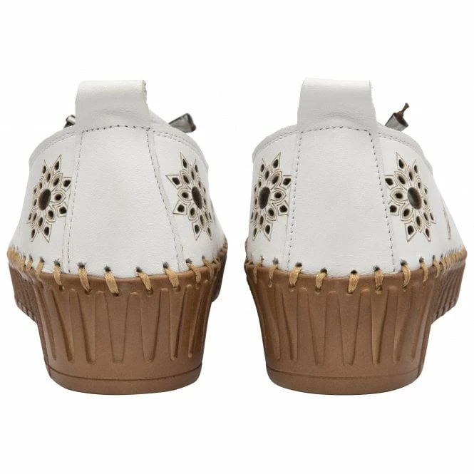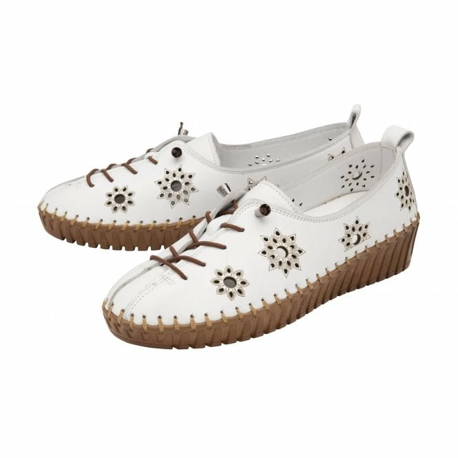 The perfect accompaniment to off duty looks is the Lotus Kristen shoe. Giving this casual white shoe a remarkable finish is laser cut out detailing that is accentuated by decorative etching on the upper. This Lotus slip-on shoe is meticulously crafted with a leather upper and lining, elasticated laces and it features a heel tab to ease getting this shoe on/off. Finished with a gum sole unit that is trimmed with blanket stitching, a subtle 4cm wedge heel and cushioned insoles, this women’s white shoe is a pure delight to wear.