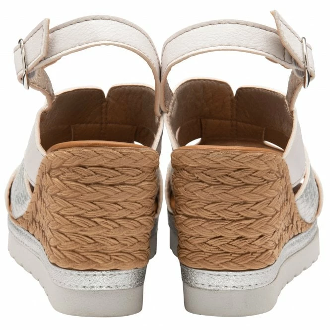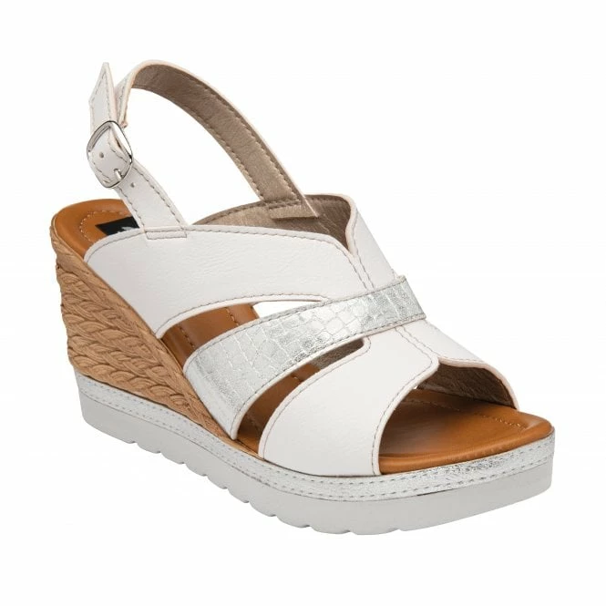 A warm-weather staple that is reminiscent of styling from the ‘70s is the Lotus Luisa wedge sandal. A trio of wide straps gives ample foot coverage, plus this Lotus open toe sandal has a highly distinctive finish due to the metallic mock-croc printed detailing and the on-trend 8cm raffia covered wedge heel. This women’s white sandal will certainly add a faultless finish to an abundance of summer looks.