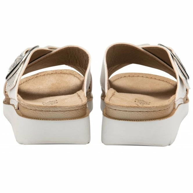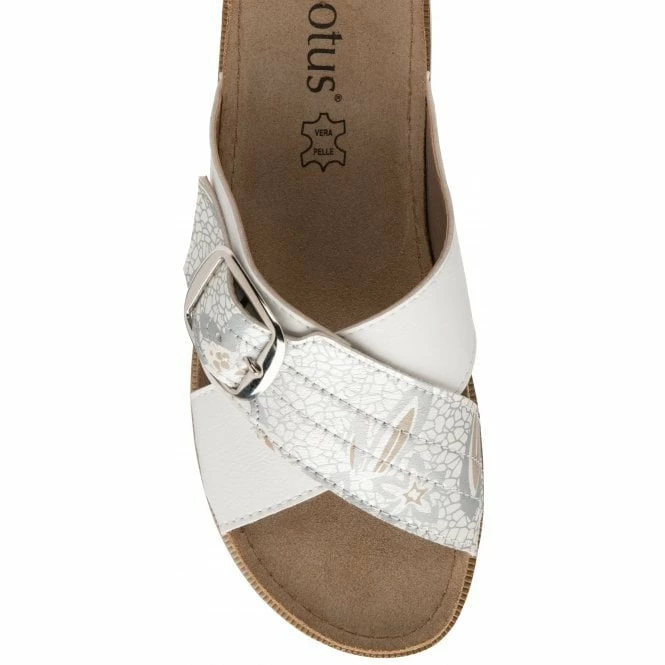 The Lotus Marta mule sandal is as comfortable as it is aesthetically pleasing. Sitting alongside a large decorative buckle feature on the cross over upper straps is an abstract floral print in silver. This women’s almost flat, slip-on, white sandal also features a leather footbed to ensure that it is exceptionally comfortable.