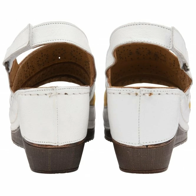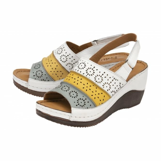 A trio of colours teamed with decorative punchwork can be found on the leather upper of the Lotus Neylan sandal. This women’s open toe white, yellow and grey sandal also encapsulates an on-trend 7cm wedge heel and comfort attributes including a leather lining, a cushioned in-sock and an adjustable rip-tape slingback for a custom fit.