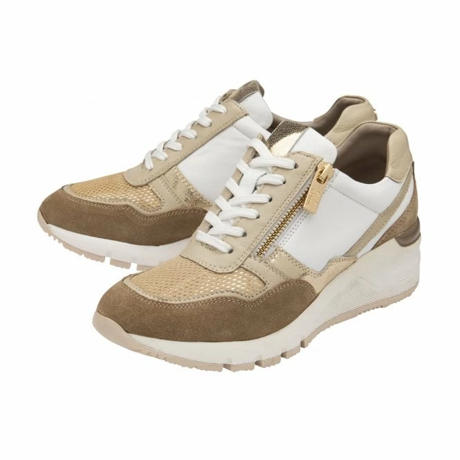 The Stressless by Lotus Sammie trainer is just the ticket for adding an athleisure vibe to workwear or for enhancing casual looks. This exceptionally versatile women’s white and natural trainer boasts a premium leather upper that is enhanced by metallic panels and trims, contrasting suede facing, side zip detailing and an on point crisp white 4.5cm wedge heel. This lightweight lace-up sneaker is also exceptionally comfortable due to the padded ankle collar and the incorporation of shock absorbing properties within the cushioned insock.